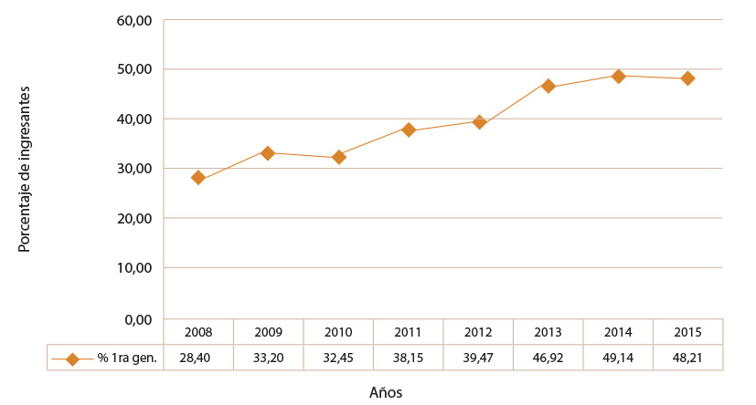 Esta dimensión de análisis sobre la primera generación universitaria de la UNLP casi no fue explorada en los trabajos relevados con anterioridad. Tampoco se encuentra información sistematizada en el Anuario 2011 de Estadísticas Universitarias de la SPU que describan el acceso de las primeras generaciones a los estudios superiores universitarios. Es posible encontrar numerosas afirmaciones que describen a las universidades localizadas en el conurbano bonaerense como instituciones compuestas en su mayoría por estudiantes de estas características (Colabella y Vargas, 2014;