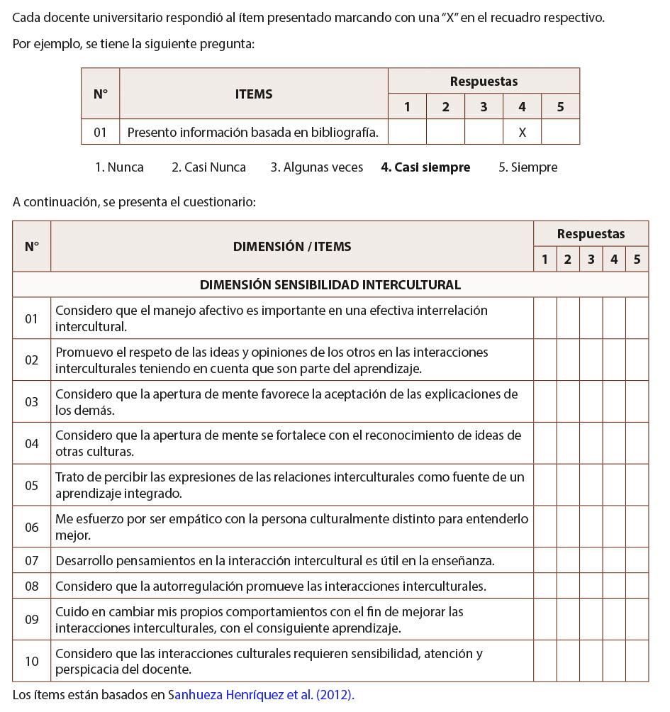 Para la obtención de la información se convocó a personal docente universitario, al cual se le aplicó el cuestionario, se les informó de su estructura y se le explicó, con un ejemplo, la manera de llenarlo de manera escrita y autoadministrada. La persona encuestada respondió sin intervención de ningún sujeto encuestador. El instrumento utilizado estuvo constituido por un conjunto de ítems de tipo opción múltiple que fueron medidos con una escala Likert de cinco puntos, de 1 a 5 (1 es nunca, 2 es casi nunca, 3 es algunas veces, 4 es casi siempre y 5 es siempre) (ver apéndice A).