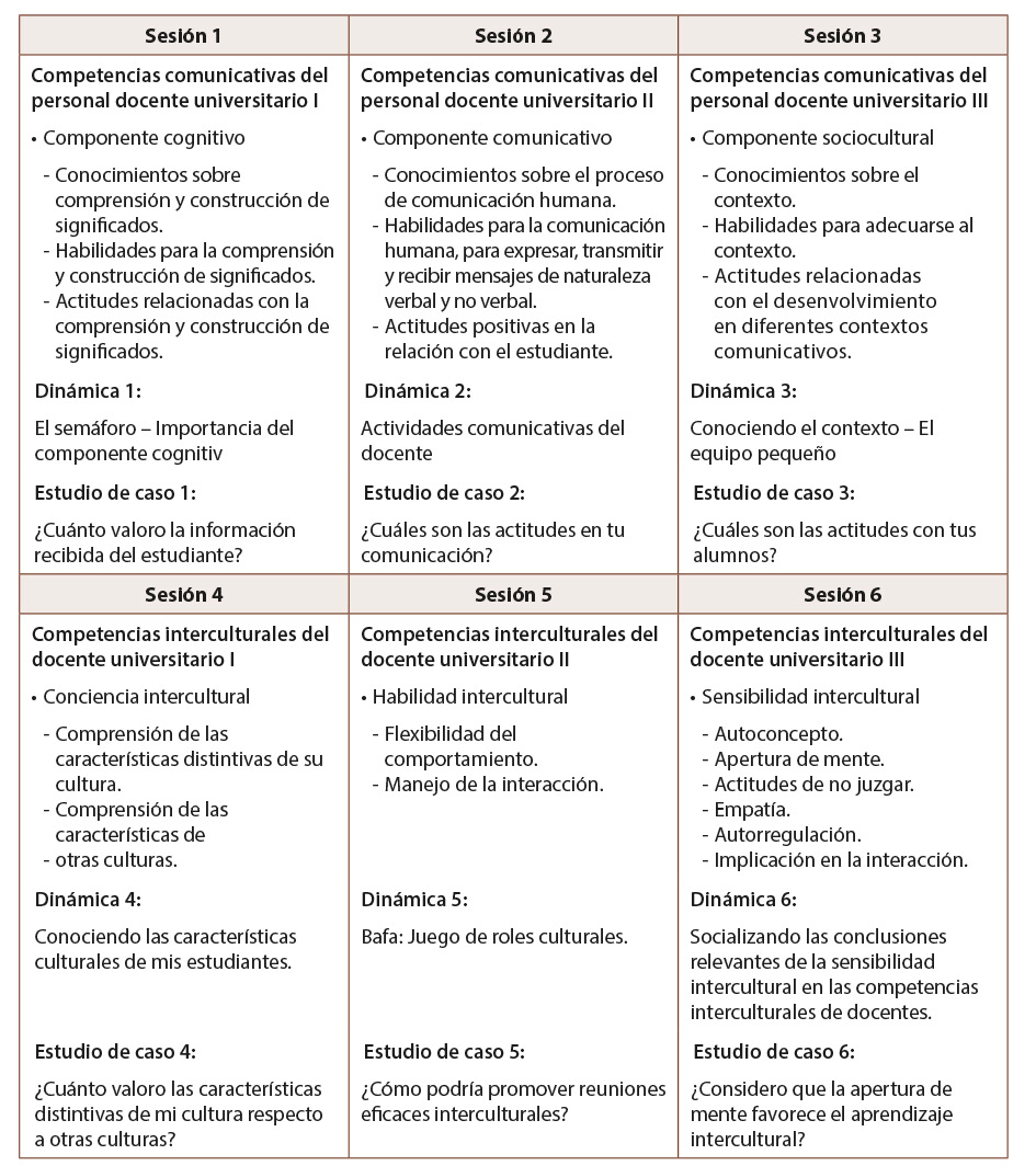 En esta investigación se aplicaron talleres, en consideración a que este es un espacio en el cual se facilita la enseñanza y aprendizaje, mediante la realización desde lo vivencial y no solo desde la transmisión. Se trata, entonces, de un aprender haciendo, donde los conocimientos se adquieren a través de una práctica concreta, realizando algo relacionado con la formación que se pretende proporcionar a sus participantes. Es una metodología participativa en la que se enseña y se aprende a través de una tarea conjunta (Careaga et al., 2006). Los talleres se realizaron en seis sesiones con una duración total de doce horas, en las cuales predominó la interacción práctica entre todos los grupos de docentes participantes con el monitoreo del equipo facilitador. El Apéndice B contiene el detalle de la temática efectuada en el taller “Comunicándonos”, así como algunas actividades realizadas en este mismo.