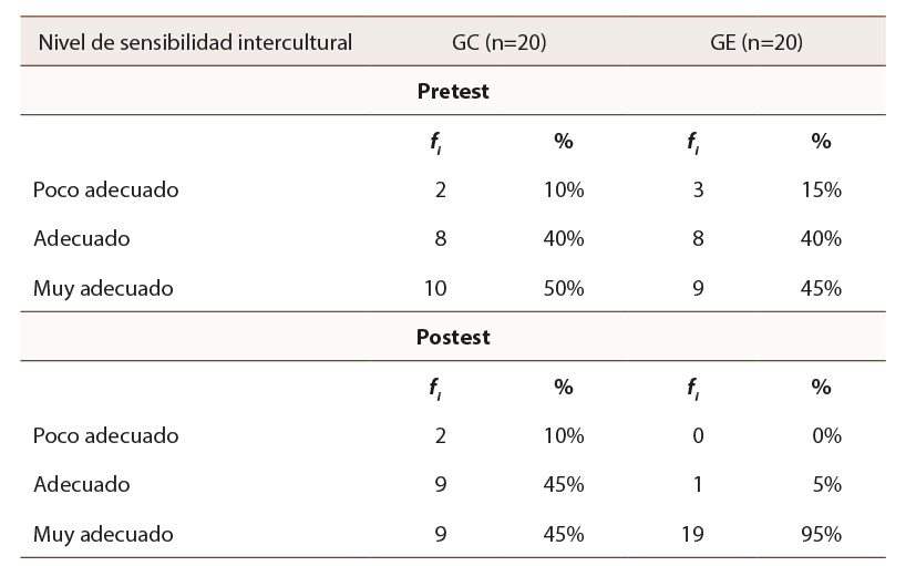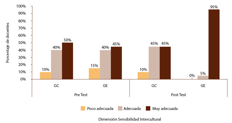 De los valores incluidos en la Tabla 1 para el nivel de sensibilidad intercultural de las competencias interculturales en personal docente universitario de un área académica profesional de una Universidad privada de Lima, 2018, se apreciaron, tanto para el GC como para el GE, resultados semejantes, se observó que entre el 10 % y 15 % del personal docente presenta un nivel de sensibilidad intercultural de poco adecuado, 40 % adecuado, y entre 45 % y 50 % muy adecuado. Se concluye: el GC y GE presentan condiciones iniciales similares en los resultados del desarrollo sobre la sensibilidad intercultural de la competencia intercultural.