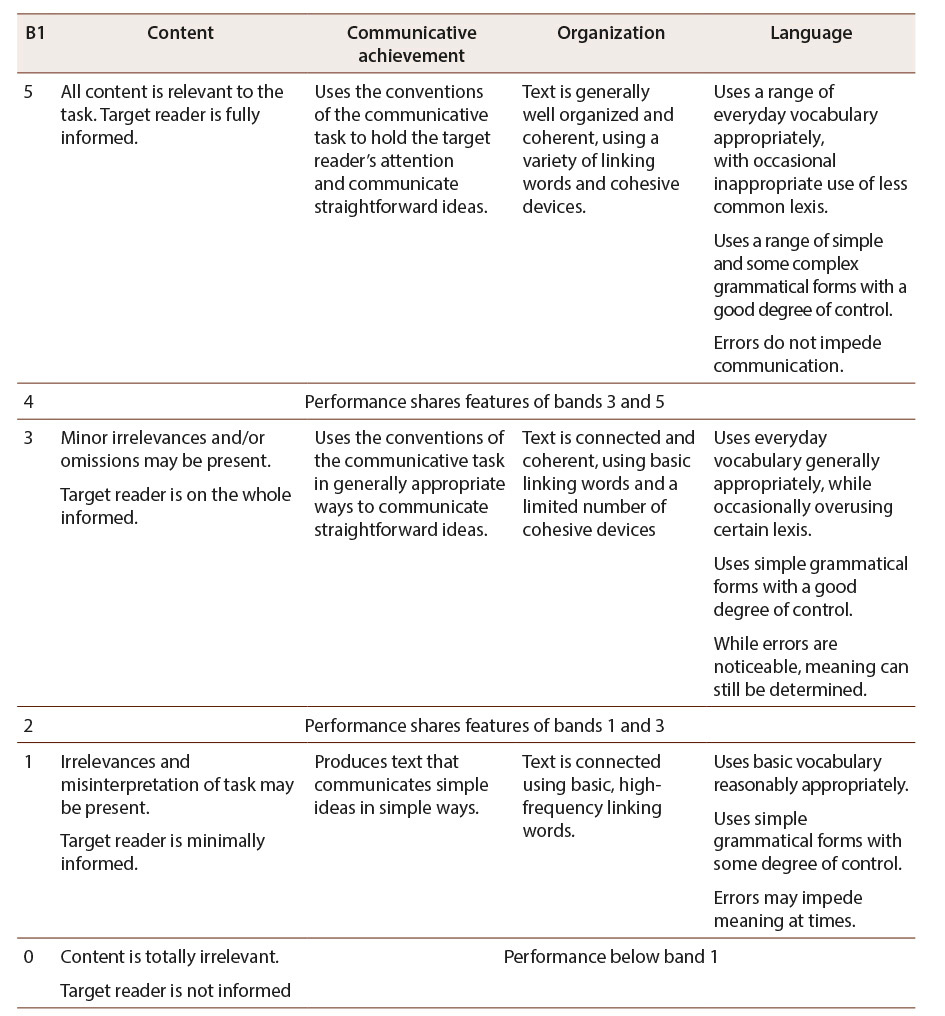 Data analysis. To guarantee consistency and dependability, both tests were marked by two TEFL faculty staff members of the university where the research took place, who, aside from marking the tests, did not participate in another other stage of the study. To mark the essay-based tests, a validated B1 rubric for writing from the University of Cambridge (Lim, 2012) was employed, which measured four criteria on the basis of a 0 - 5 scale: organization, communicative achievement, content, and language. The test results were statistically analyzed by a professional in the area using the specialized software SPSS, 22 version. This analysis yielded descriptive and inferential findings.