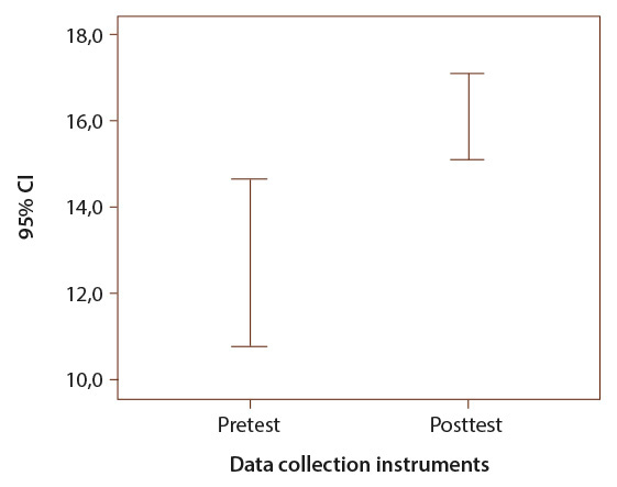 Lastly, the behavior of the results of the tests applied before and after the treatment is portrayed in Figure 1, which was developed on the basis of the total means and standard deviations of both tests.