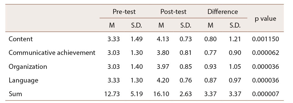 Note: Table designed and developed by the authors of this paper. Content (t 3.607, df 29, p .001), Communicative achievement (t 4.678, df 29, p .000), Organization (t 4.877, df 29, p .000), Language (t 4.878, df 29, p .000), Sum (t 5.475, df 29, p .000).