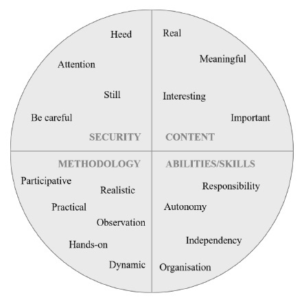 Finally, participants had to tell at least the first three words that came into their minds when thinking about field trips and, afterwards, what or how they can learn during those outdoor activities. Those words were collected and organized in four different groups, as in Figure 1, labelled with methodology, security, content and abilities/skills, as they emerged from the data. For the first one, all the words related to how the learning is were included, for instance practical. Insecurity was gathered those linked to actions they have to do in outdoor activities to ensure protection, such as attention. For content, there are the ones which give information about the type of knowledge they can achieve, by way of illustration it is meaningful. In the case of abilities/skills, there are the learnings and personal growth they affirm doing during school trips as autonomy.