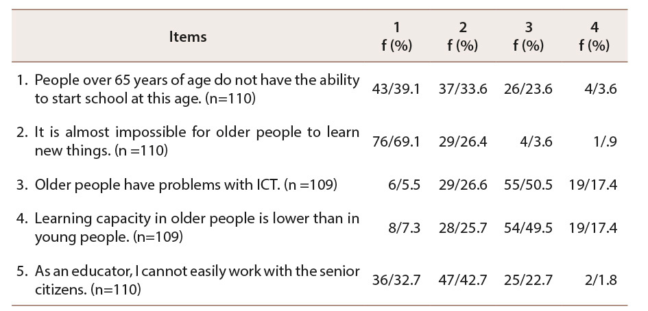 Table 1: Questionnaire on Educational Stereotypes of Older Adults (CEEAM) (I. 1-5) and Questionnaire on Evaluating Negative Stereotypes of Older People (CENVE) (I. 6-16)