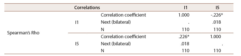 In the analysis carried out, similarities were found in the answers to questions 1 and 5. A 27.2 per cent of the participants consider that those over 65 years old do not have the capacity to start studying (P1). The 24.5 per cent indicates that group with which it will not be easy for him to work as an educator (P5). We have performed the non-parametric Spearman correlation, having found a significant correlation at the 0.05 level (bilateral) (Table 3).