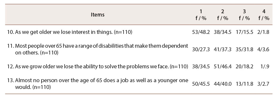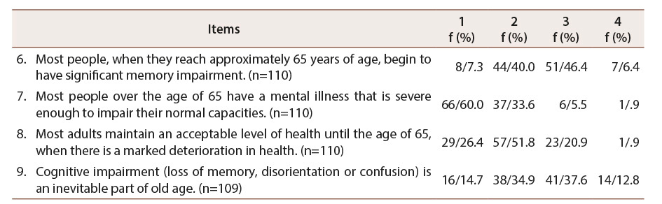 The group of Health Factor issues is composed of 4 items that address issues related to older adults, and express claims of impaired health, cognitive impairment and mental illness. Health Factor is made up of items 6, 7, 8 and 9, which were subjected to a descriptive statistical analysis of frequencies (see Table 4).