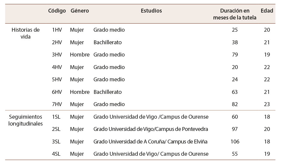 En lo referente a la muestra de jóvenes (Ver Tabla 1), se realizó un muestreo teórico teniendo en cuenta los siguientes criterios en la selección: 1) que durante su itinerario vital hubiesen estado en situación administrativa de tutela; 2) que hayan conseguido obtener el título de graduado en ESO. La tutela es una medida administrativa que se aplica en situaciones de desamparo. El interés de la presente investigación requiere de garantizar una muestra con juventud que haya vivenciado situaciones de dificultad social severa. Los criterios específicos son: 1) para las historias de vida se contó con jóvenes que cuanto menos hubieran iniciado estudios post obligatorios; 2) para los seguimientos longitudinales se contó con alumnado que cursase estudios universitarios.