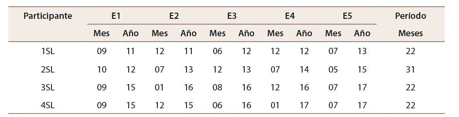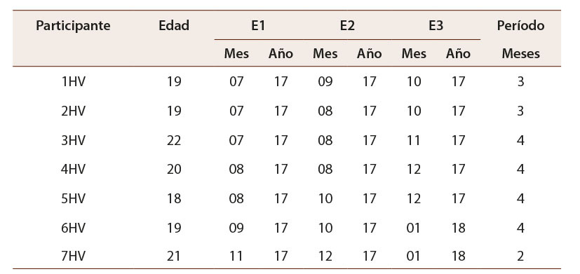 Los seguimientos longitudinales se iniciaron en septiembre el 2011 y se finalizaron en julio del 2017 (ver Tabla 3). Se realizaron 5 entrevistas en profundidad con cada participante. La media en meses, entre la primera y la última entrevista, es de 12,4. La muestra se compuso íntegramente por alumnas. La media de edad al inicio de los seguimientos es de 19,5 años. No se consiguió localizar a ningún hombre que fuese tutelado en Galicia y que cursase estudios universitarios en el período indicado. La media de duración de la medida administrativa de tutela es de 79,5 meses.