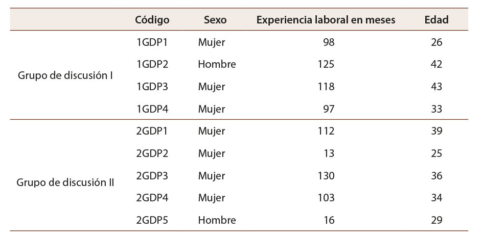 El proceder, propio de la teoría fundamentada, se trianguló con dos grupos de discusión compuestos por profesionales que, en el momento de la investigación, estaban trabajando en recursos de atención a la infancia y a la adolescencia de las provincias de Ourense y Pontevedra. Todas las figuras profesionales disponían de formación especializada en la materia, es decir, diplomatura o grado en educación social. El criterio de selección fue que contasen con al menos un año de experiencia en el sistema (Ver Tabla 4). La elevada rotación del personal y el trabajo a turnos dificultaron la configuración de una muestra de participantes con conocimiento profundo de la cuestión. Las participantes en el grupo I tienen una experiencia laboral media de 109,5 meses. La media de meses trabajados en el Grupo II es de 74,8. La edad media de las figuras profesionales en ambos grupos es de 34,1 años.