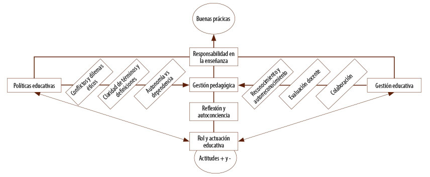 Nota: Las líneas gruesas, con una punta de flecha, contienen los elementos conceptuales de políticas y gestión educativas que incurren con la gestión pedagógica, indicando una implicación horizontal con un mismo fin, ya que son conocimientos que direccionan, organizan y resuelven en el desarrollo de un proceso educativo de calidad. La línea delgada con puntas de flechas en ambos extremos, indican la fragilidad de las actuaciones entre la docencia y los directivos, en ambos sentidos, cuando existe conflicto de intereses o pedagógicos que llevan a la disonancia comunicativa.