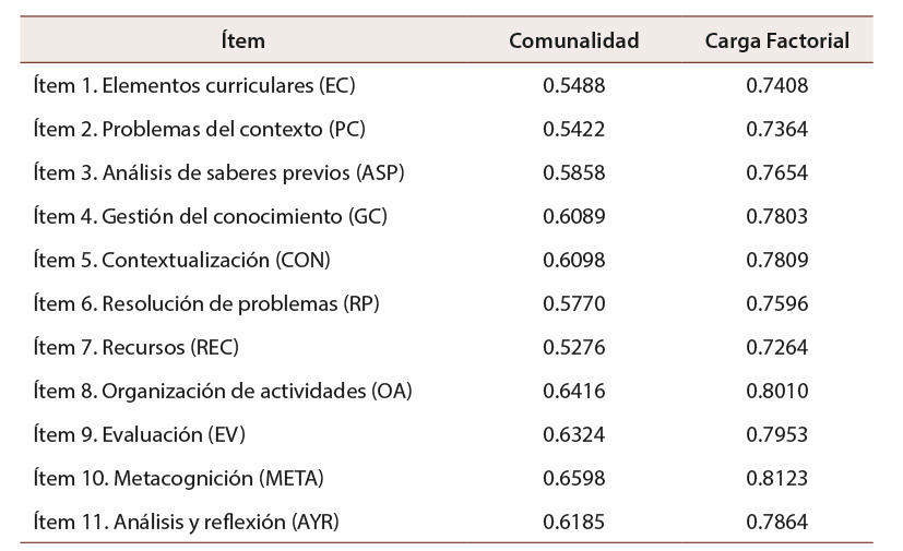 En este orden, del análisis de validez de constructo mediante el AFE se indica la correspondencia con el modelo teórico, al encontrar la representación de todos los ítems con cargas factoriales significativas a un solo factor, similar a lo reportado por Ávila-Camacho et al. (2019). A este respecto, como se indicó, en ambos casos se ha revelado la existencia de un solo factor, con lo que se denota la unidimensionalidad del instrumento y que desde la perspectiva teórica significa la existencia de un único rasgo subyace a las respuestas de los sujetos a los ítems (Hattie, 1985, citado en Burga León, 2006) e indica la presencia de consistencia interna, lo cual indica que los 11 ítems del instrumento efectivamente miden una sola variable: la secuencia didáctica, coincidiendo con el primer análisis.