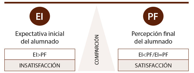 Desde estos antecedentes, este trabajo tiene como finalidad dar a conocer las premisas de un proyecto de innovación centrado en la tutoría universitaria y su procedimiento didáctico, además de analizar los resultados de satisfacción del alumnado con el enfoque metodológico utilizado en distintos títulos de grado universitario vinculados al área de conocimiento de la Educación. La satisfacción es entendida como variable encubierta en la valoración de las expectativas iniciales y percepción final del alumnado, pues como indica Pereira (2011), la satisfacción del estudiantado egresado suele ser medida como una variable manifiesta y no tanto como variable latente o constructo, un error habitual. Este estudio adopta el proceso de confirmación y desconfirmación de la satisfacción basado en la comparación de expectativas y percepción final de Boshoff (1997), y lo adapta al ámbito educativo.