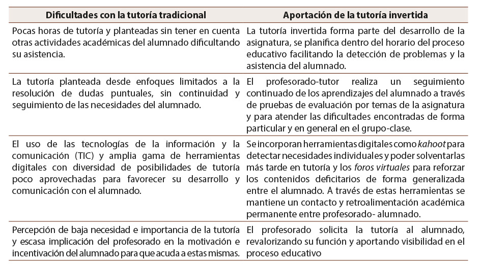 Tabla 2: Dificultades del estudiantado con la tutoría tradicional y aportación de la tutoría invertida