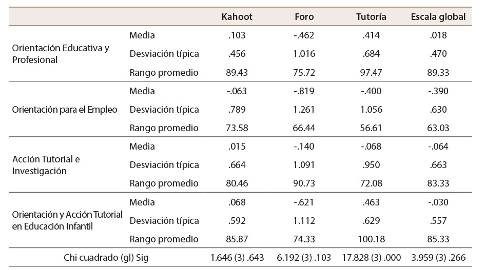 Una vez obtenidas las evidencias de validez de la estructura interna sobre la nueva variable de satisfacción latente, y confirmada su consistencia, los resultados indican diferencias significativas en las valoraciones de las tres subescalas con la prueba de Friedman 31.401(2), p=.000, el alumnado muestra la satisfacción más alta con la tutoría (M=.106, DT=.898), seguido de Kahoot (M= .034, DT=.628) e insatisfacción con el uso de los foros virtuales (M= -.386, DT=1.121).