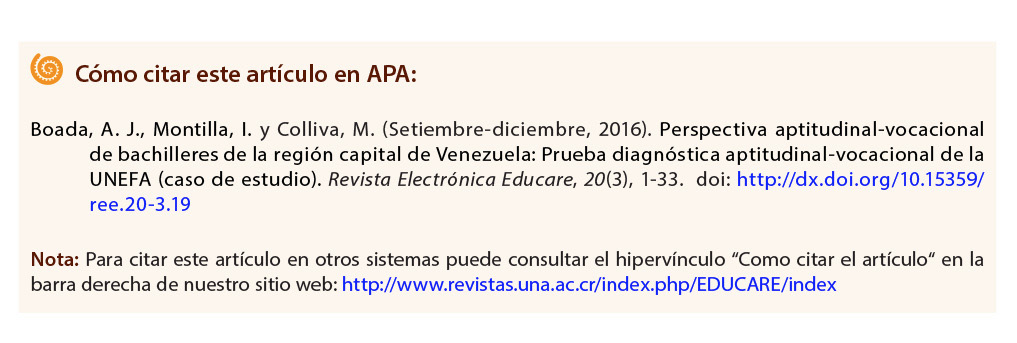 Boada, A. J., Pérez, B. y Millán A. (2012). Procedimiento aptitudinal - vocacional de orientación para estudiantes a ingresar a las universidades oficiales. Caso UNEFA 2009. En H. Cairo, A. Cabezas, T. Mallo, E. Del Campo y J. Carpio (Eds.), XV encuentro de latinoamericanistas españoles. Congreso Internacional “América Latina: La autonomía de una región” (pp. 435-449). Madrid: CEEIB. Recuperado de https://halshs.archives-ouvertes.fr/halshs-00874487/document