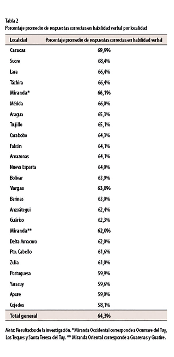 En la habilidad verbal, estudiantes que presentaron la prueba diagnóstica obtuvieron resultados interesantes a nivel de cada localidad: Las zonas de Caracas y Miranda Occidental estuvieron por encima del promedio nacional (64,3% de respuestas correctas), mientras el estado Vargas y Miranda Oriental estuvieron por debajo en 0,5 y 1,3 puntos porcentuales, respectivamente.