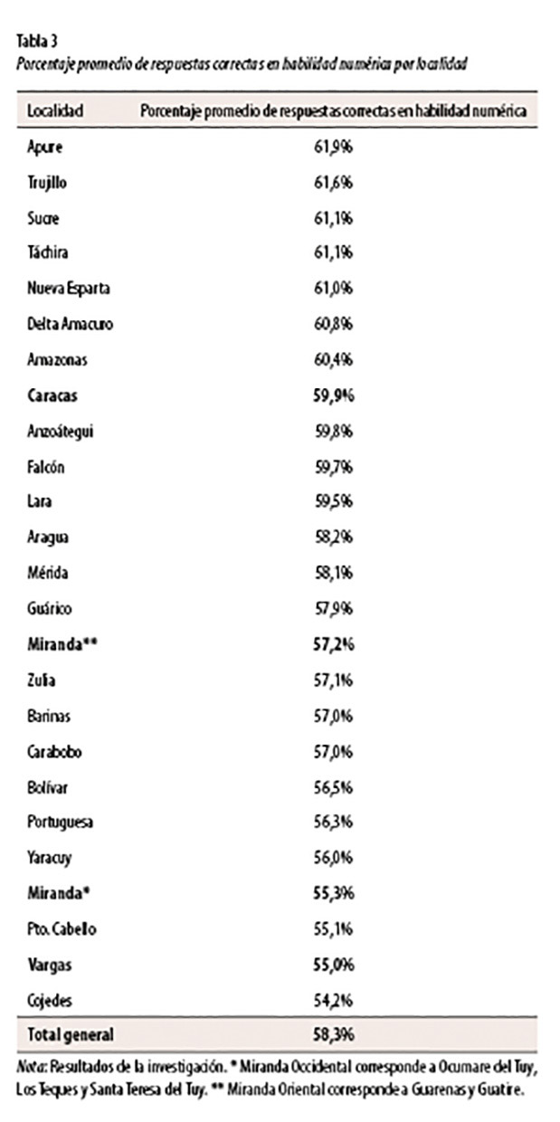 En cuanto a habilidad numérica, el estudiantado que presentó la prueba diagnóstica obtuvo resultados positivos únicamente en Caracas, donde su promedio fue superior al nacional (58,3% de respuestas correctas); mientras las zonas de Miranda Oriental, Miranda Occidental y Vargas, estuvieron por debajo en 0,9; 3,0 y 3,3 puntos porcentuales, respectivamente.