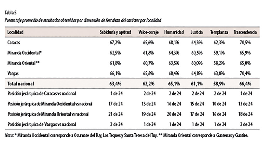 Los resultados obtenidos a nivel vocacional (fortaleza del carácter) de las localidades de Caracas y Miranda versus el total nacional, se observan en la tabla 5.
