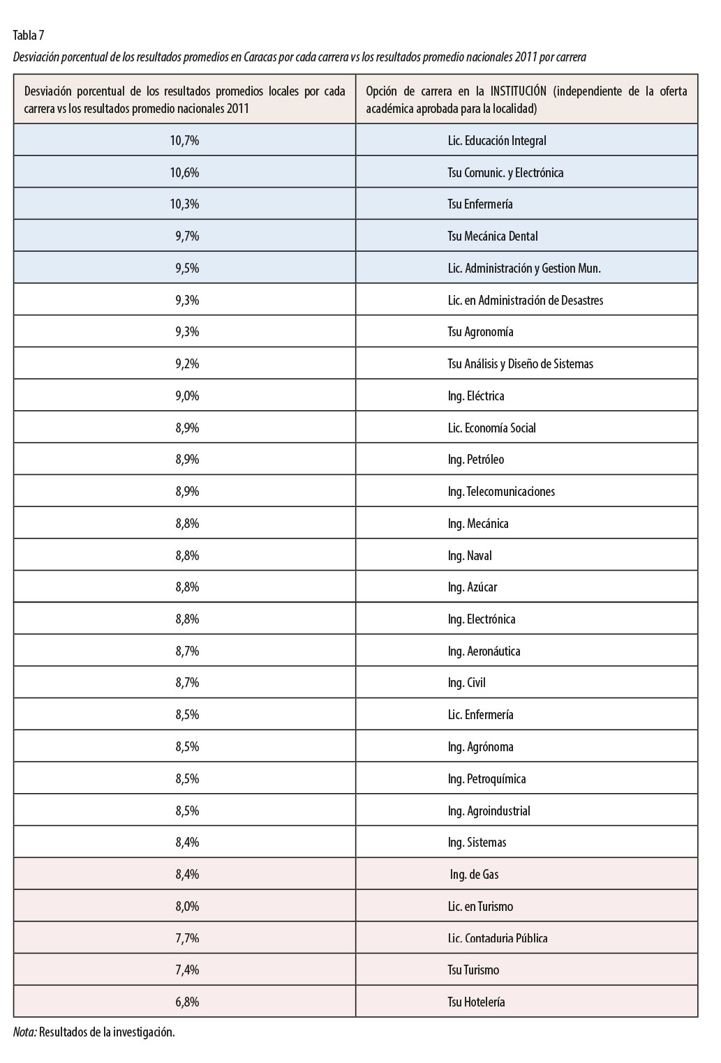 A continuación, determinaremos, la desviación porcentual de los ajustes promedios del núcleo según los resultados nacionales. Esta información se encuentra jerárquicamente organizada, resaltando aquellas carreras que presentan mayor valor de desempeño local, según el desempeño nacional y aquellas carreras que presentan menor desempeño local según los resultados nacionales (tabla 7).