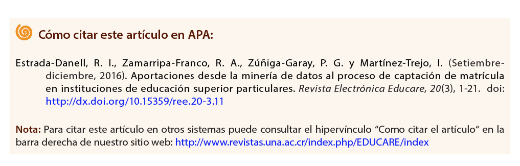 Nandeshwar, A. y Chaudhari, S. (2009). Enrollment prediction models using data mining [Modelos de predicción de matrícula utilizando minería de datos]. Recuperado de http://nandeshwar.info/wp-content/uploads/2008/11/DMWVU_Project.pdf