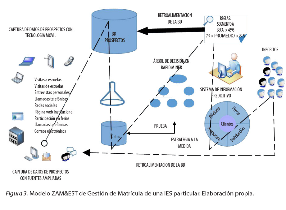 En la figura 3 se muestra el modelo ZAM&EST de gestión de matrícula que resulta de la aplicación del árbol de decisión y del análisis del proceso de matrícula de una IES particular. Este modelo integra todos los elementos generados a lo largo del proceso, los cuales son los siguientes: captura de datos de sujetos prospectos, almacenamiento de los datos, filtrado y refinación de datos, construcción del árbol de decisión, generación de las reglas del modelo, el sistema de información predictivo, la estrategia a la medida y estudiante que se han inscrito. A continuación, se analiza cada uno de ellos.