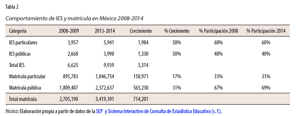 En México, el número de IES particulares registró un explosivo crecimiento en los años 60. Producto de esta explosión, en 2014 el sector particular participa del 60% del total de las IES del país. No obstante, en últimos años se registra un crecimiento a la par de ambos sectores. Entre 2008 y 2014, el número total de IES aumentó en 50%, las IES públicas y particulares aumentaron en este mismo periodo en 50%, ambas en la misma proporción; por su parte el incremento de estudiantes en el periodo mencionado es de 26%, en este periodo; la captación de las IES particulares pasó de representar el 33% al 31%, mientras que el sector público pasó del 67% al 69%. En la tabla 2 se puede consultar a detalle el crecimiento y la participación de los sectores públicos y particulares en lo que respecta a educación superior en México.