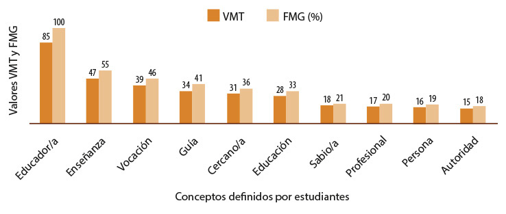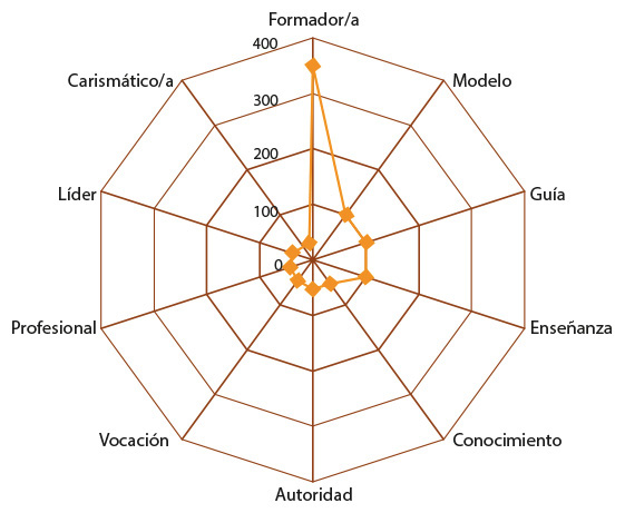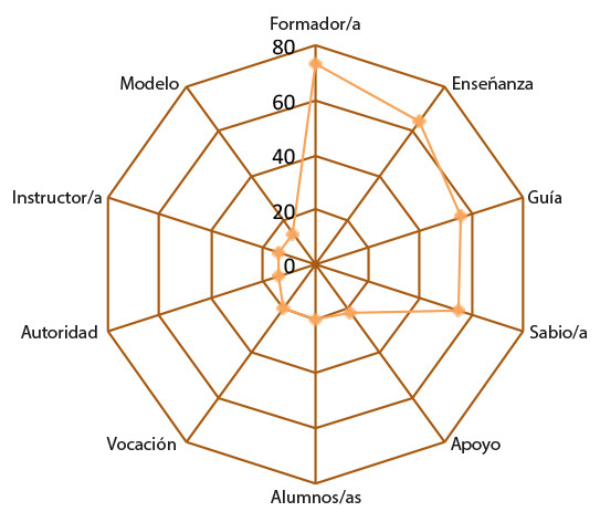 Por otro lado, hay un conjunto de conceptos que tienen un peso semántico entre un 19% y 26%, ellos son: Líder, Cercano/a y Ayuda. Por último, figura un grupo de tres conceptos alejados y que registran valores FMG cercanos al 10%. Estos conceptos son: Orientador/a, Facilitador/a y Constructor/a. Cabe señalar que la riqueza semántica de la red estuvo compuesta por un total de 32 definidoras.
