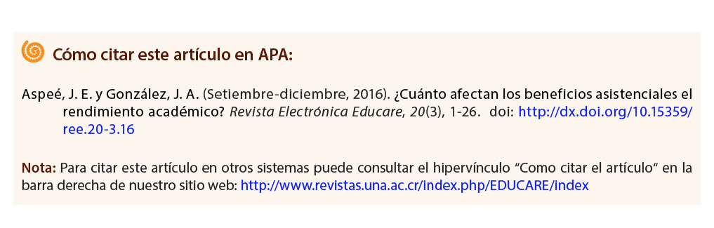 Gómez, F. J. (Agosto, 2014). El impacto de las becas escolares en el rendimiento académico de los alumnos de licenciatura de la UANL. Daena: International Journal of Good Conscience, 9(2), 1-11. Recuperado de http://www.spentamexico.org/v9-n2/A1.9(2)1-11.pdf