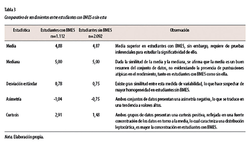 Para desarrollar este contraste, se ha confeccionado la siguiente tabla de resumen descriptivo para la variable rendimiento académico, según goce de BMES (tabla 3).