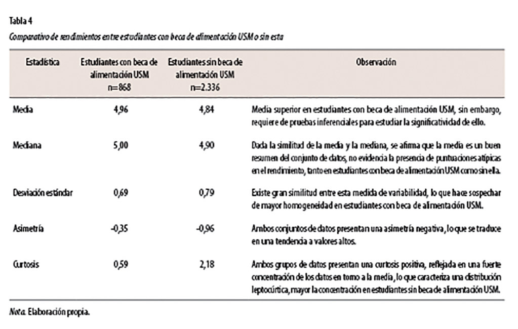 A razón del estudio descriptivo y dada sus diferencias, se procedió a la realización de la prueba inferencial t-student para comparación de medias en datos no pareados, para determinar si es factible afirmar la existencia de diferencias significativas entre ambos grupos. Los resultados de la prueba fueron: El p-valor fue de 4,106e-05, el cual es menor que el 5% de significancia, por ello se rechaza la hipótesis de igualdad de medias entre estudiantes con beca de alimentación USM o sin esta, estableciéndose un mejor rendimiento en estudiantes con goce de esta beca. En consecuencia, se afirma que existe evidencia en los datos para soportar diferencias significativas, referentes al disponer de beca de alimentación USM, en el rendimiento académico.