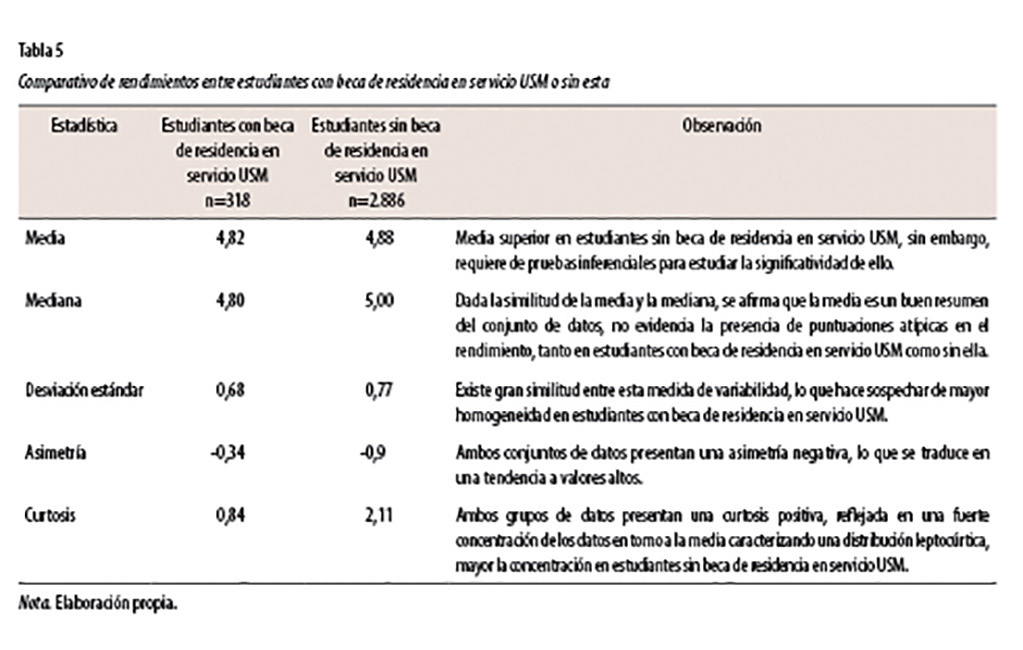 Considerando la descripción precedente, se procedió a la realización de la prueba inferencial t-student para comparación de medias para datos no pareados, para determinar si es posible afirmar la existencia de diferencias significativas entre ambos grupos de estudiantes. Los resultados de la prueba fueron: El p-valor fue de 0,1199, el cual es mayor que el 5% de significancia, por ello no se rechaza la hipótesis de igualdad de medias entre estudiantes con beca de residencia en servicio USM o sin esta, pues se establece un rendimiento similar en estudiantes con la beca en cuestión o sin esta. Por ende, es factible aseverar que no existe evidencia en los datos para soportar diferencias significativas relativas al disponer de beca de residencia en servicio USM en el rendimiento académico.