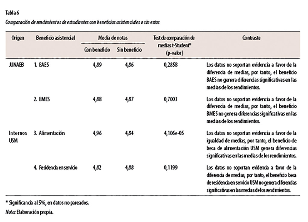 Concluyendo: El grupo de estudiantes con beneficios asistenciales presenta un rendimiento académico similar que el que no tiene estos beneficios, y aunque estos explican parte del rendimiento académico (calificaciones obtenidas), su magnitud es insustancial. Además, la investigación mostró que existe un conjunto de factores desconocidos en los datos analizados, que pudiera explicar más del 80% del rendimiento de las alumnas y los alumnos de la Universidad Técnica Federico Santa María, sede Casa central, en el tiempo y espacio analizado. En consecuencia, los beneficios asistenciales no impactan fuertemente en el rendimiento académico. No obstante, esto no merma su jerarquía como elemento constitutivo de oportunidades educativas. De la misma manera, esto no descarta otros efectos que pudieran generar el goce o no de beneficios asistenciales, tales como efectos en la retención, en las tasas de titulación y en la percepción de calidad. El desafío queda planteado.