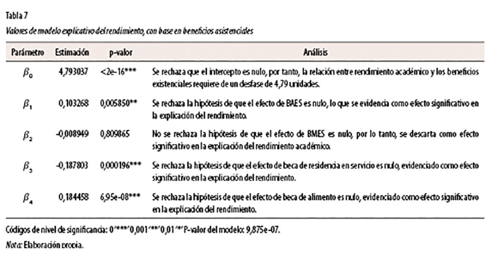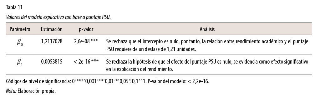 Con base en el criterio estadístico del p-valor y un nivel de significancia del 5%, se señala que el modelo presentado resultó ser útil para explicar el 8,2% del rendimiento académico (p-valor: < 2,2e-16). Este coeficiente de determinación es el mayor encontrado hasta el momento y sobrepasa los efectos que pudiera generar el acceso a becas asistenciales (ver valores en tabla 10). No obstante, no es el gran factor condicionante del rendimiento académico.