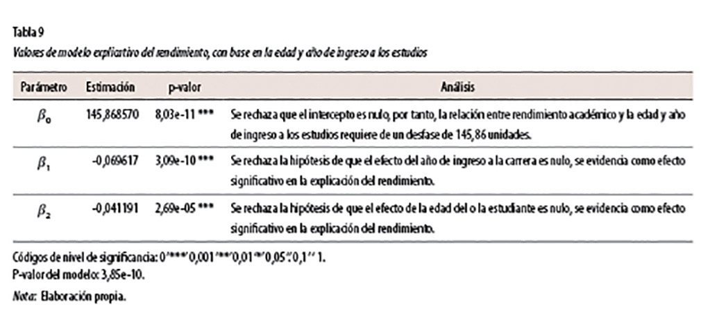 El coeficiente de determinación del modelo propuesto establece que el 1,3% de la nota final de la alumna o el alumno (de la muestra estudiada) se explica por la edad y por el año de ingreso a la educación superior. Esto significa que a mayor edad disminuiría el rendimiento académico y que a menor experiencia universitaria ocurriría la misma situación (ver valores en tabla 9). Esto se señala con un nivel de confianza de un 95% (p-valor 3,85e-10).