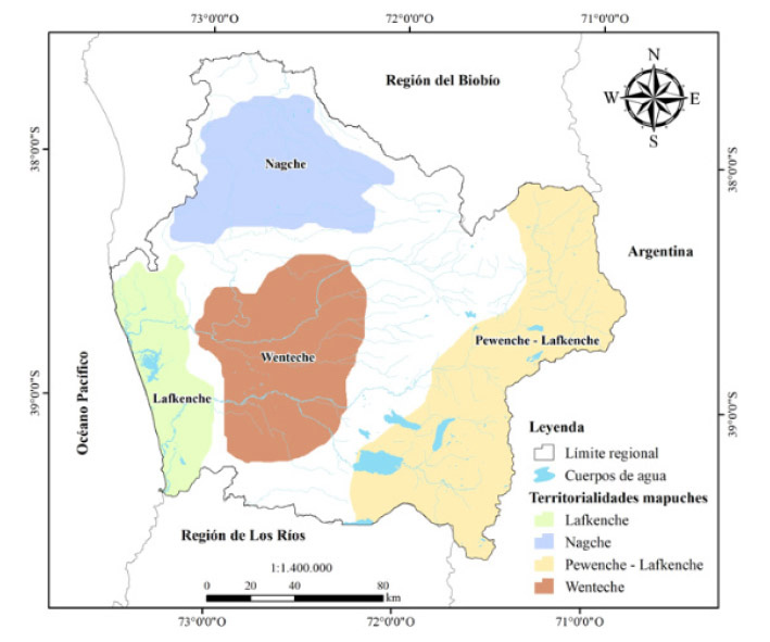 Territorialmente, como se observa en la Figura 1 “La Araucanía se localiza entre los 37° 35’ y los 39° 37’ de latitud sur y los 70° 50’ y los 73° 28’ de longitud oeste, en el centro sur de Chile” (Peña-cortés, Rozas-Vásquez, Pincheira-Ulbrich y Hepp, 2017, p. 228). Su composición política actual es de 2 provincias; “32 comunas y 8 territorios de planificación, según su base física, tendencia al crecimiento o decrecimiento, su composición étnica o multicultural” (Henríquez, 2013, p. 155). Sin embargo, antes de la colonización española, la sociedad mapuche habitaba la región y había dispuesto su propia distribución política de acuerdo con las características de los territorios que ocupaban (Consejo Nacional de la Cultura y las Artes, 2011). Estas identidades reflejan los espacios de los pueblos indígenas y constituyen hitos geográficos reconocidos por la sociedad tanto indígena como occidental atribuyéndose a los territorios contenidos sociales, políticos y culturales (Maureira y Quidel, 2003). De acuerdo con la clasificación realizada por el Informe de la Comisión de Verdad Histórica y Nuevo Trato (2003), se identifican cuatro territorios; i) Lafkenche (borde costero) territorialidad compuesta por las actuales comunas de Carahue, Teodoro Schmidt, Toltén y Saavedra (Peña-Cortés, Almendra y Rojas-Maturana, 2010); ii) Pewenche (sector cordillerano) territorio de la pre cordillera de los Andes, está compuesto por la comuna de Lonquimay, Melipeuco, Curarrehue y Curacautín; iii) Naqche (Valle central cordillerano), este territorio se ubica en el valle de la cordillera de Nahuelbuta, se caracteriza por tener una alta población mapuche (Consejo Nacional de la Cultura y las Artes, 2011) y se compone por las comunas de Galvarino, Chol-Chol, Lumaco, Purén, Traiguén y los Sauces, y; iv) Wenteche (Valle central), este territorio está compuesto por las comunas de Pitrufquén, Freire, Nueva Imperial, Temuco, Padre las Casas, Cunco y Vilcún (Consejo Nacional de la Cultura y las Artes, 2011).