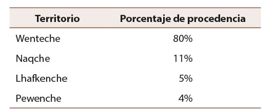 En relación con la descripción territorial mapuche, como se observa en la Tabla 2, el 80% proviene de territorio Wenteche, el 11% del territorio Naqche, el 5% del territorio Lhafkenche y solo el 4% del territorio Pewenche. El porcentaje de estudiantes disminuye de acuerdo con la lejanía de la comuna respecto de Temuco, por ejemplo, el 23% proviene de Padres de las Casas y el 8% de Villarrica. Los porcentajes de estudiantes provenientes de zonas asociadas a la ruralidad son los menores.