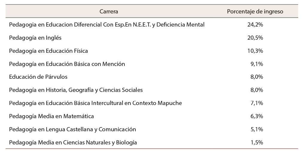 Respecto de la matricula por carreras, el 24,2% de estudiantes prefiere la carrera de Educación diferencial y el 20,5% Pedagogía en inglés; estas dos carreras son las que presentan la mayor cantidad de ingreso de estudiantes mapuches. Las carreras con menor ingreso de estudiantes mapuches son Pedagogía Media en Ciencias Naturales y Biología con el 1,5%. Es preciso remarcar que en los últimos años ha disminuido la matricula general de esta carrera. En tanto que la carrera de pedagogía en Lengua Castellana y Comunicación presenta una matrícula porcentual de 5,1%. Mientras que el ingreso a la carrera de Educación Básica Intercultural es de un 7,1% del total de estudiantes mapuches de la Facultad de Educación (Tabla 3).