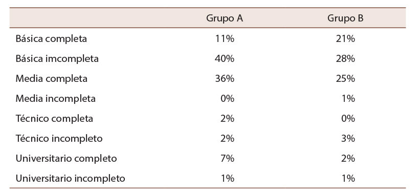 Respecto de estudiantes que obtuvieron puntajes entre 600 y 700 (grupo B) son hijos e hijas de madres que tuvieron el menor porcentaje de educación, dado que solo el 2% de ellas logró un título universitario. El 25% de las madres no culminó con éxito su educación básica, en tanto que otro 25% de ellas, logró completar satisfactoriamente la enseñanza media. Ahora bien, al comparar el nivel educacional de las madres de los dos grupos notamos que estudiantes con menor promedio de puntaje NEM presentan el mayor porcentaje de madres universitarias. Sin embargo, no podríamos generalizar ni establecer una significancia del capital cultural del estudiantado, dada la poca diferencia estadística entre los porcentajes obtenidos.