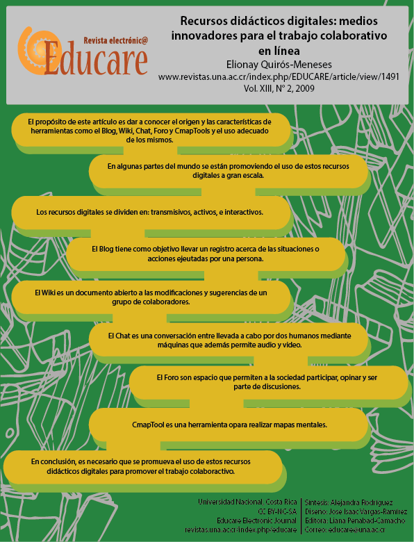 El propósito de este escrito es dar a conocer el origen, las características y las reglas de Blog, Wiki, Chat, Foro y la herramienta Cmap Tools, aspectos fundamentales para un adecuado uso de estos recursos digitales. Además, el principal aporte que se brinda es explicitar los usos didácticos posibles que ofrecen estos recursos, como una propuesta estratégica dinámica para el trabajo colaborativo en línea.