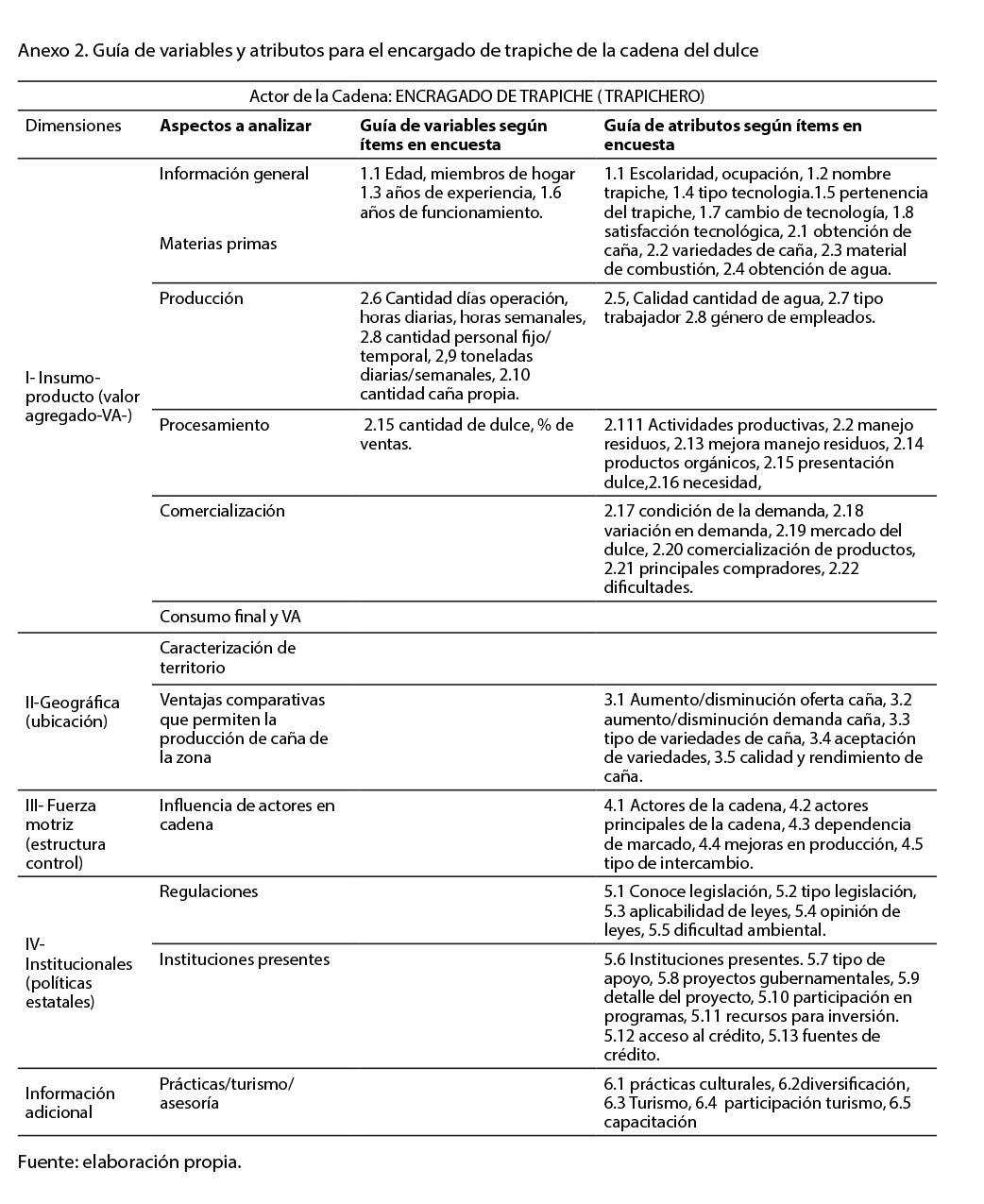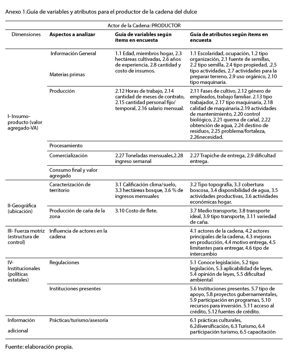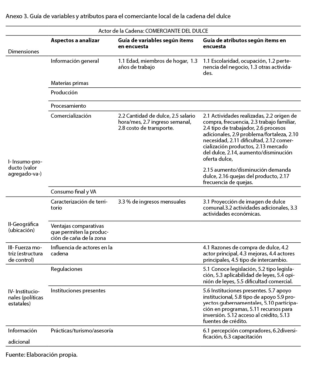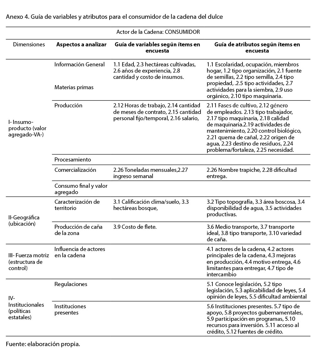 Por lo tanto, se colectó información de toda la cadena del dulce. Según la naturaleza de la información requerida, así se abordaron los diferentes elementos con los actores correspondientes (ver tabla 1), posteriormente se agruparon según las dimensiones del desarrollo sostenible (ambiental, social, económico e institucional) para su posterior análisis por dimensión.