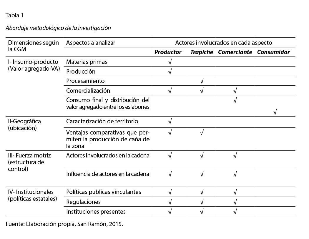 Resumen: El artículo presenta una descripción general del funcionamiento de los agentes que componen los eslabones de la cadena de producción y comercialización de la panela (dulce producido del jugo de la caña de azúcar), con el objeto de determinar el efecto socioeconómico y ambiental de esta actividad sobre la zona geográfica donde operan los eslabones agrícola y agroindustrial. Se emplean el enfoque de cadenas globales de mercancías (CGM) y el de desarrollo sostenible, los cuales permiten establecer las interconexiones socioeconómicas entre los diferentes agentes y actores alrededor de un producto, así como los efectos ambientales sobre la zona de influencia. Este estudio logra determinar el efecto de los productores de caña y las industrias familiares procesadoras de panela (trapiches), ubicados en los primeros eslabones de la cadena como dinamizadores del desarrollo sostenible y la agricultura familiar en la comunidad de La Paz de San Ramón, Costa Rica.