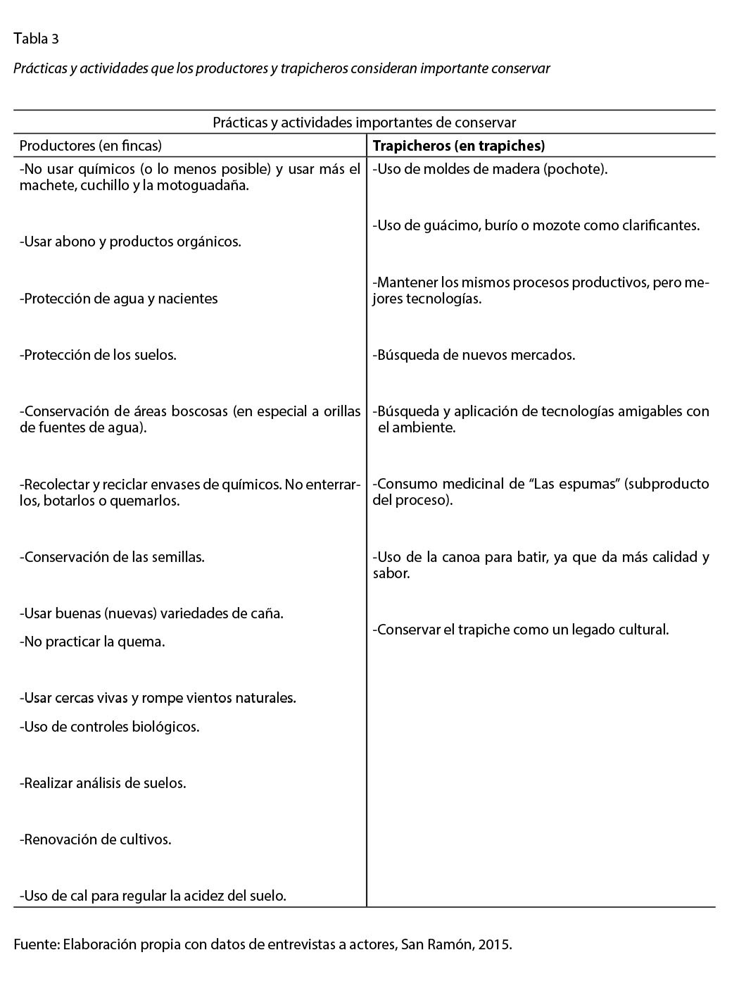 Por último, se consultó a los productores y trapicheros por prácticas que realizan en su finca o trapiche, que consideran importantes de conservar la calidad del ambiente para las futuras generaciones, estas se presentan en la tabla.