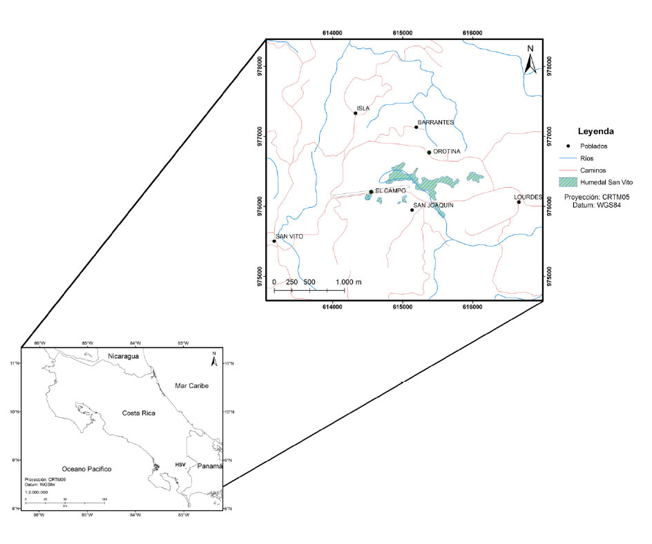 El cantón de Coto Brus está dividido en seis distritos: San Vito, Sabalito, Agua Buena, Limoncito, Gutiérrez Braun y Pittier. El humedal de San Vito se ubica en el poblado de San Joaquín, distrito San Vito en las coordenadas geográficas 8°49’36.15” de Latitud Norte y 82°57’3.01” de Longitud Oeste. Mediante decreto N° 22879-MIRENEM, se declara el Humedal de San Vito, constituido por la Laguna de San Joaquín en toda su extensión, localizada en la Hoja Cartográfica Cañas Gordas N° 3642 III, escala 1:50.000 del Instituto Geográfico Nacional, con un área de 93 764,73 metros cuadrados (Figura 1).
