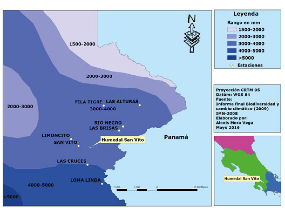 El IMN (2008) indica que San Vito se encuentra en la Región Climática Pacífico Sur, en donde la línea base 1961-1990 establece que la precipitación anual para las estaciones meteorológicas de San Vito, Río Negro, Limoncito, Fila Tigre, Las Alturas y Las Brisas va desde los 3 000 mm hasta los 4 000 mm (Figura 2).