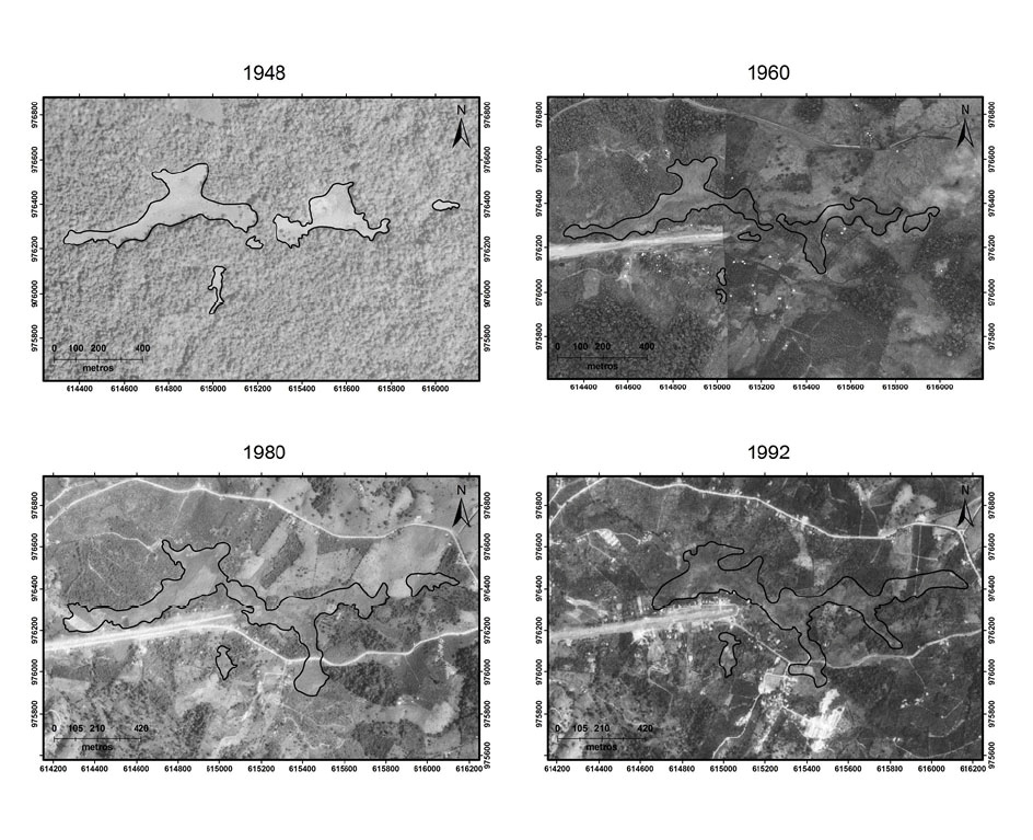 Figura 3. Cambios en el humedal San Vito entre 1948 y 1992. Fuente: IGN, fotografías aéreas 1948, 1960, 1980 y 1992.