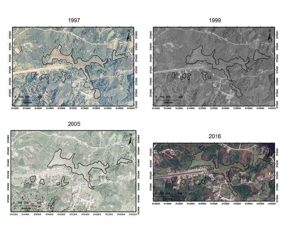Figura 5. Cambios en el humedal San Vito entre 1997 y 2016. Fuente: IGN, fotografías aéreas 1997, 1999; CARTA 2005 y Google Earth 2016.