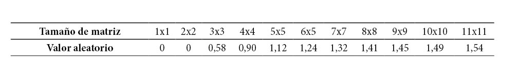El IA representa el índice de consistencia de una matriz recíproca generada aleatoriamente a partir de una escala de 1 a 9, con juicios de valor recíprocos y diagonal = 1 (Gómez & Barredo, 2005). Está generado por la multiplicación de matrices. Saaty definió una tabla de variables según el tamaño de la matriz (Cuadro 2).