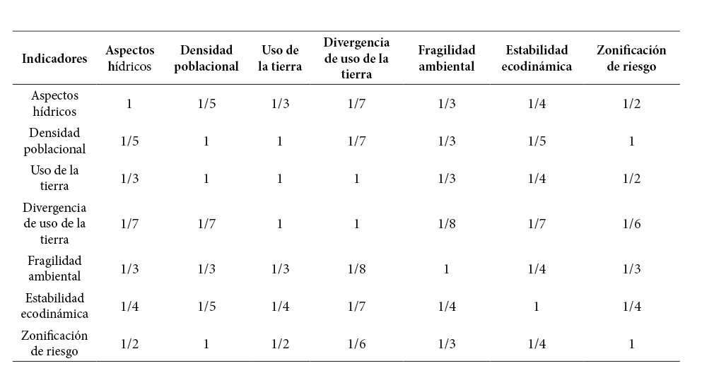 El método de jerarquías analíticas se hace por comparaciones binarias de criterios. Se establece una matriz de los indicadores por los indicadores dándoles un valor de importancia. El método Saaty permite emplear desde 3 hasta 15 variables, y en este estudio la matriz es de 7x7 indicadores. En cada par de criterios binarios se establece un orden de categorías según la escala de valor de juicios de Saaty (Cuadro 1). Los valores van desde 1 hasta 9, los valores 2, 4, 6 y 8 son valores intermedios entre las escalas; por lo tanto, a cada par de variables se le da una escala de medición (Gómez & Barredo, 2005).