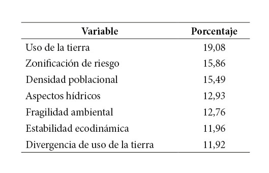 Según Gómez & Barredo (2005), cuando la escala de medición es 1, significa que ambas variables son igualmente importantes; por ejemplo: la zonificación riesgo perjudica directamente a la población; además, la divergencia del uso de la tierra se deriva del uso de la tierra. La escala 1/2 y 1/3 refieren cuando una variable es ligeramente más importante que otra; por ejemplo: el recurso hídrico determina a la zonificación de riesgo ya que, según el tratamiento, uso de aguas y el uso del espacio el riesgo puede incrementar o disminuir. En las escalas 1/4, 1/5 y 1/6 se trata cuando una variable es notablemente más importante que otra; por ejemplo: la estabilidad ecodinámica del territorio se ve relacionada con el resto de variables en esta categoría, porque no es excluyente sino complementaria. Los pesos 1/7 y 1/8 se relacionan cuando una variable es más importante que otra. En este caso, la mayoría de las variables se presentan como más significativas que la divergencia del uso de la tierra, resultado del uso de la tierra y de su capacidad. Al normalizar los datos entre los totales, resultan los pesos estadísticos para la zonificación ambiental, detallados en el Cuadro 4.